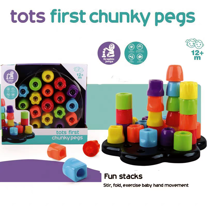 Match, stack, build and sort the pegs in all kinds of shapes and sizes. This set is perfect for developing fine motor skills and improving hand eye coordination in babies and toddlers.